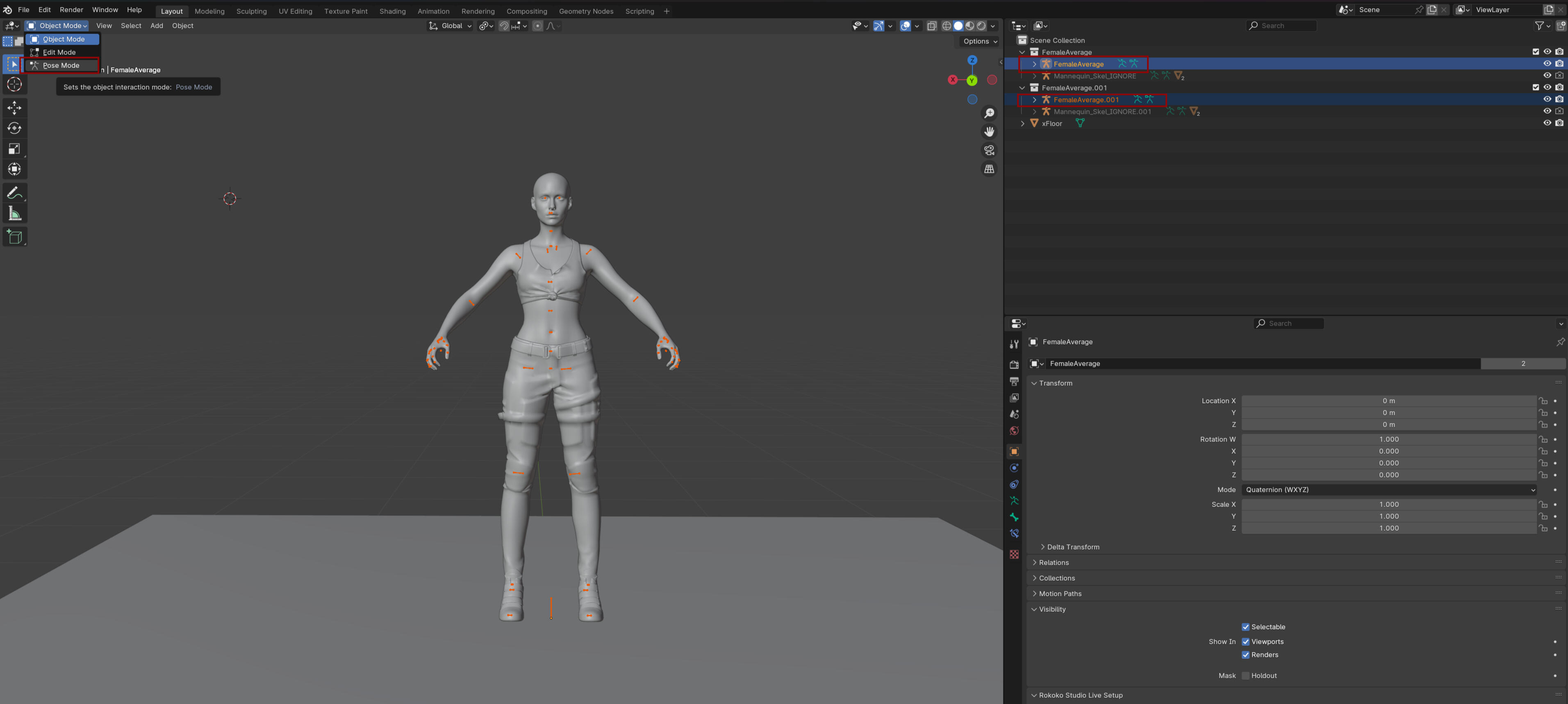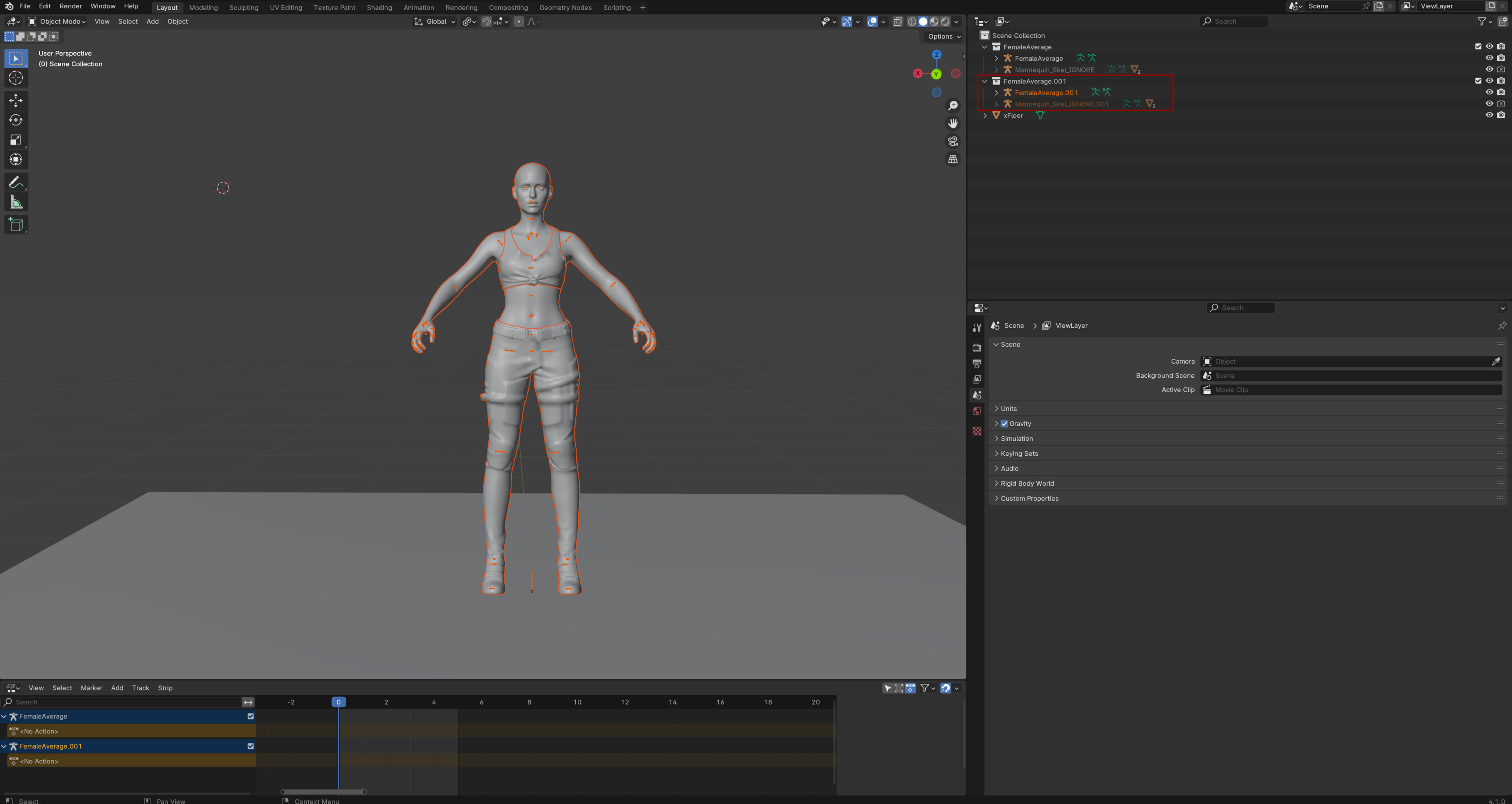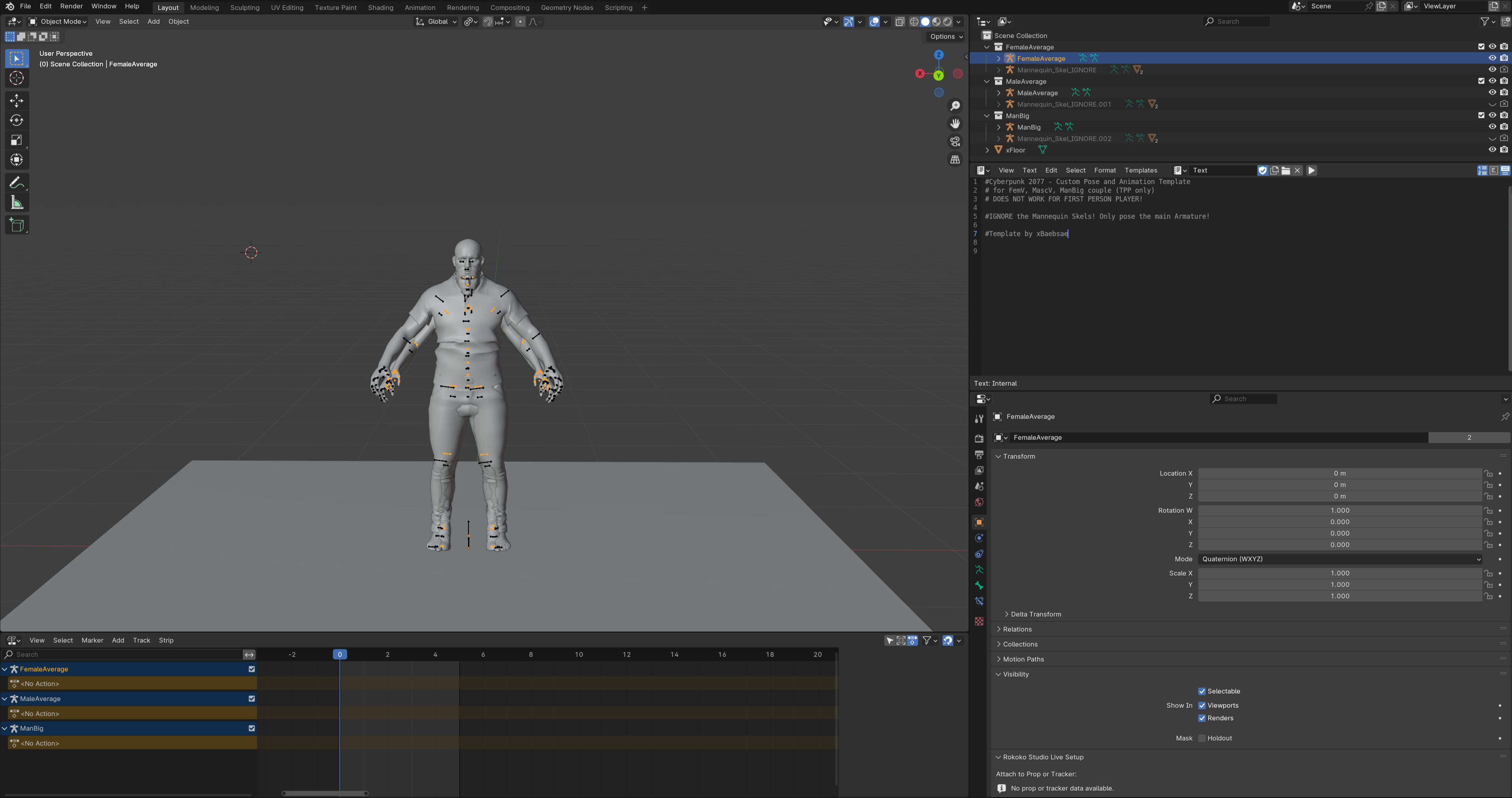 So first thing you need to know is how many models you need and which body types you need per pose. There is technically no limit in Blender but there is a limit in Photomode which is four. However more can be added with AMM.If you are looking at doing multiple pairings for example with couples poses making FF and FM you will need to make separate Wolvenkit projects and see them as variants under one poses pack. You could technically combine it all into one project but it will be a huge mess to navigate so separate is just easier.Now the only place something will be different is Blender when it comes to multi-character poses. Everything else literally stays the same. You name things in Wolvenkit as normal, path properly in the xl file, add the pack name to the localization file and still add the poses to the yaml file as normal. As such I will focus on just the Blender part.For this guide I will be adding a second Fem Model to a Fem Model file. Okay open up Blender with whichever body you are using! I'm using the combined body from xBaebsae Anim Templates since I figure most people new to pose making will have that one.