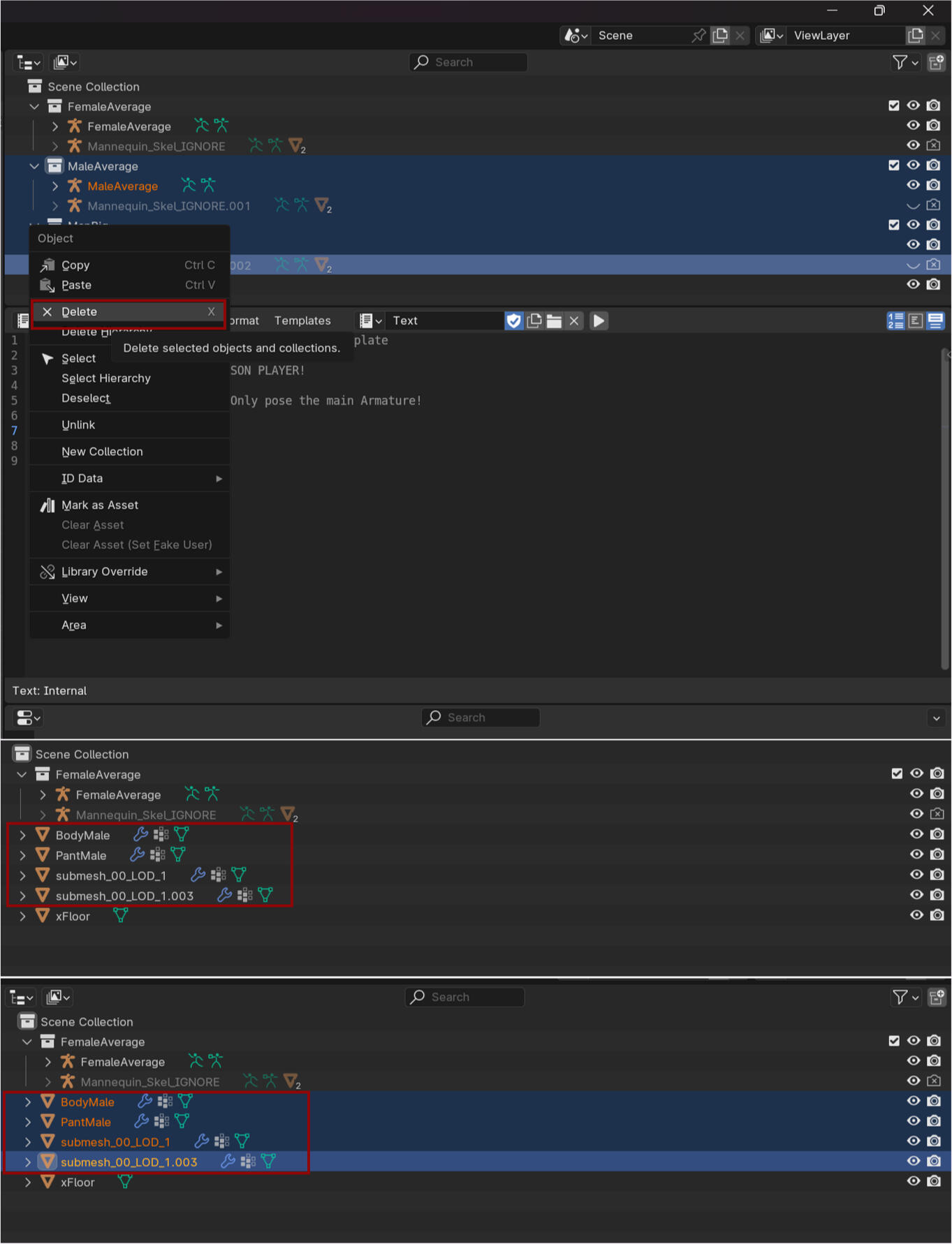 I won't need Male and Male Big for this so I am going to just delete them from the file.I'm going to select the bodies I don't want in the scene collection and delete them. Usually there will be a bunch of parts left behind so delete those if you have them.