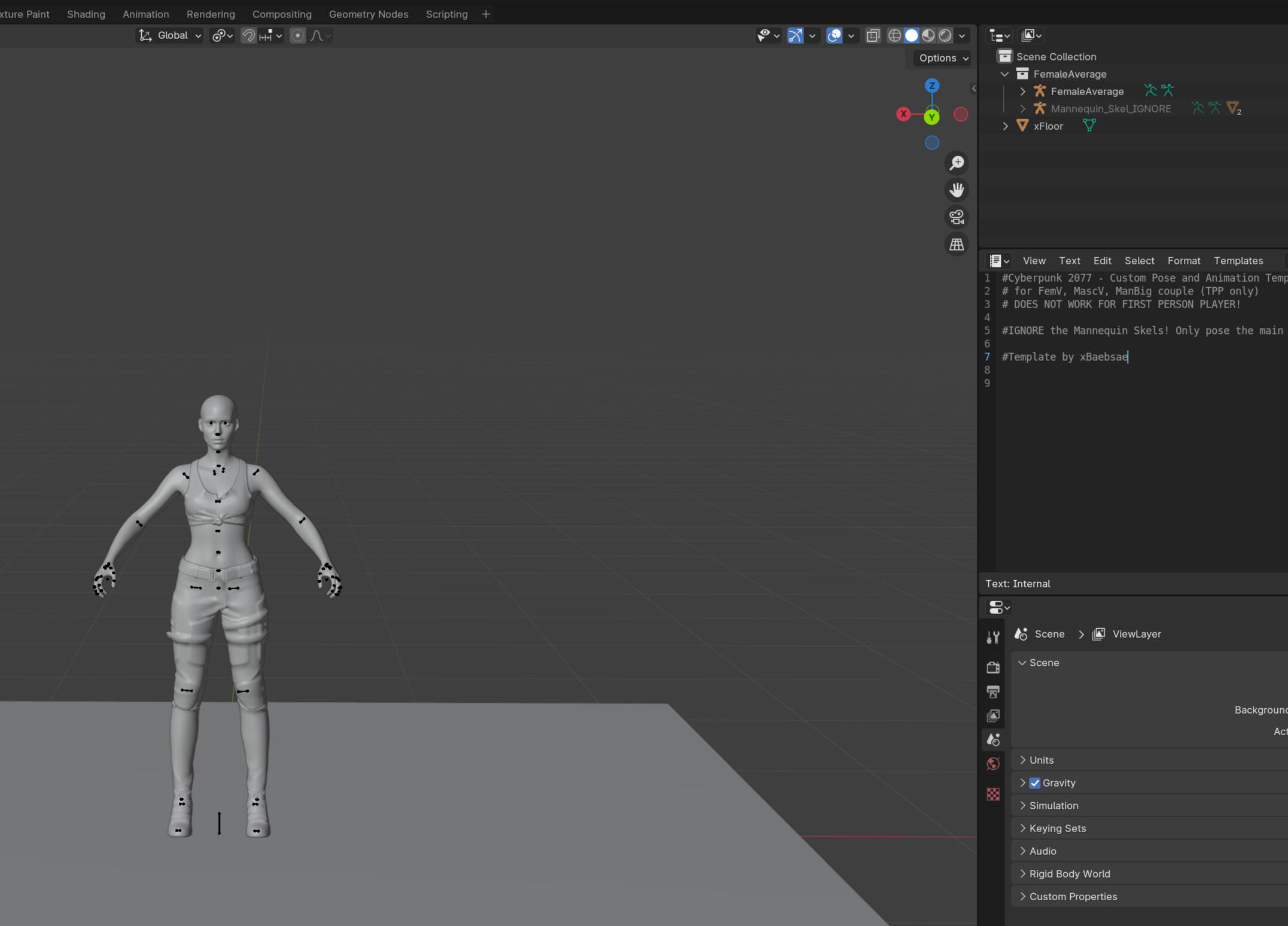 So first thing you need to know is how many models you need and which body types you need per pose. There is technically no limit in Blender but there is a limit in Photomode which is four. However more can be added with AMM.If you are looking at doing multiple pairings for example with couples poses making FF and FM you will need to make separate Wolvenkit projects and see them as variants under one poses pack. You could technically combine it all into one project but it will be a huge mess to navigate so separate is just easier.Now the only place something will be different is Blender when it comes to multi-character poses. Everything else literally stays the same. You name things in Wolvenkit as normal, path properly in the xl file, add the pack name to the localization file and still add the poses to the yaml file as normal. As such I will focus on just the Blender part.For this guide I will be adding a second Fem Model to a Fem Model file. Okay open up Blender with whichever body you are using! I'm using the combined body from xBaebsae Anim Templates since I figure most people new to pose making will have that one.