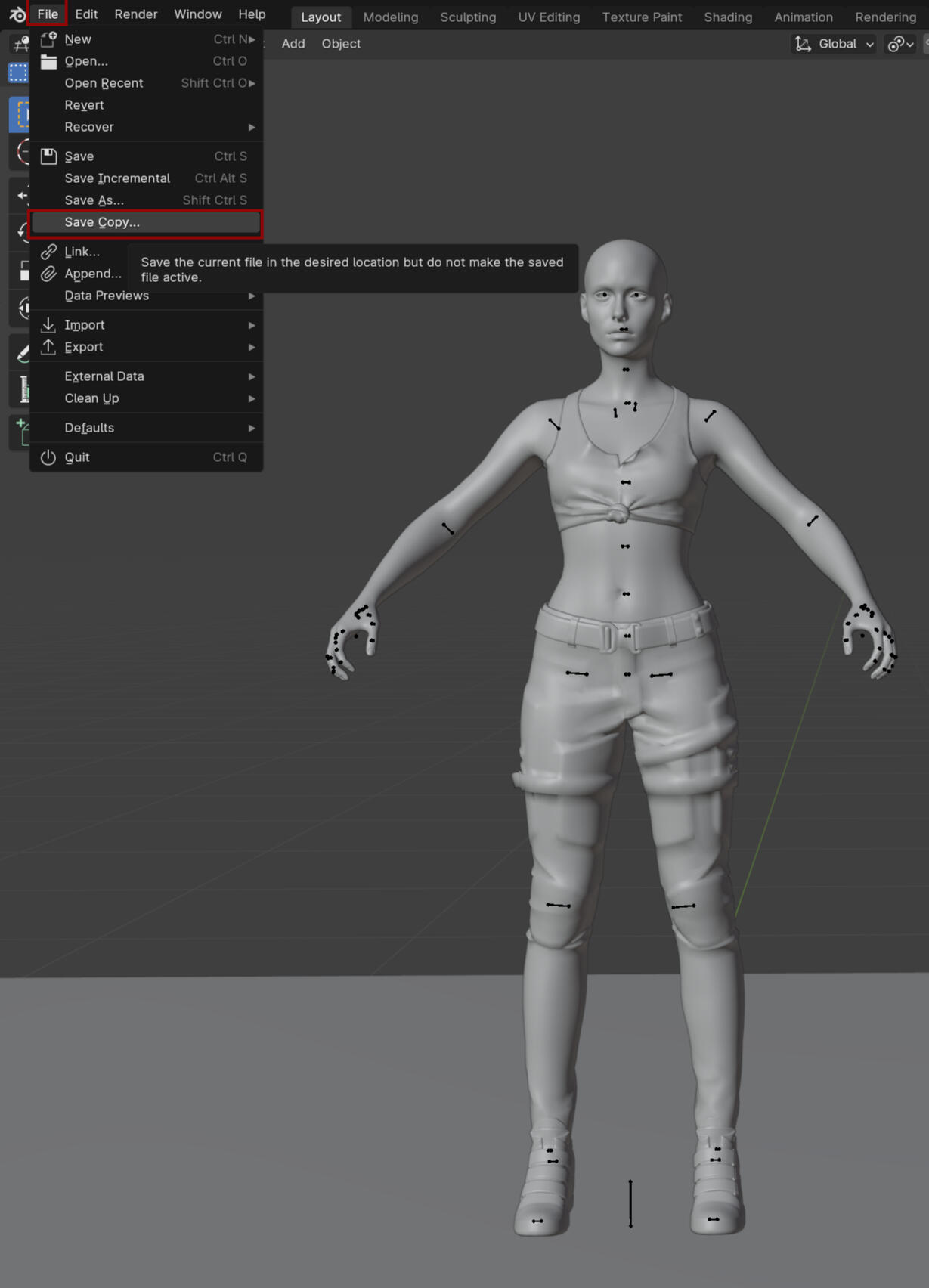 If you are making a multi-character pose with the same body type like I'm doing save this cleaned up file by using the Save Copy option and give it a new name! The reason we do this is because you cannot append a file with the same name and Save As sets it as the active file! Also its nice to just have as a clean version without the other bodies if you don't have it.