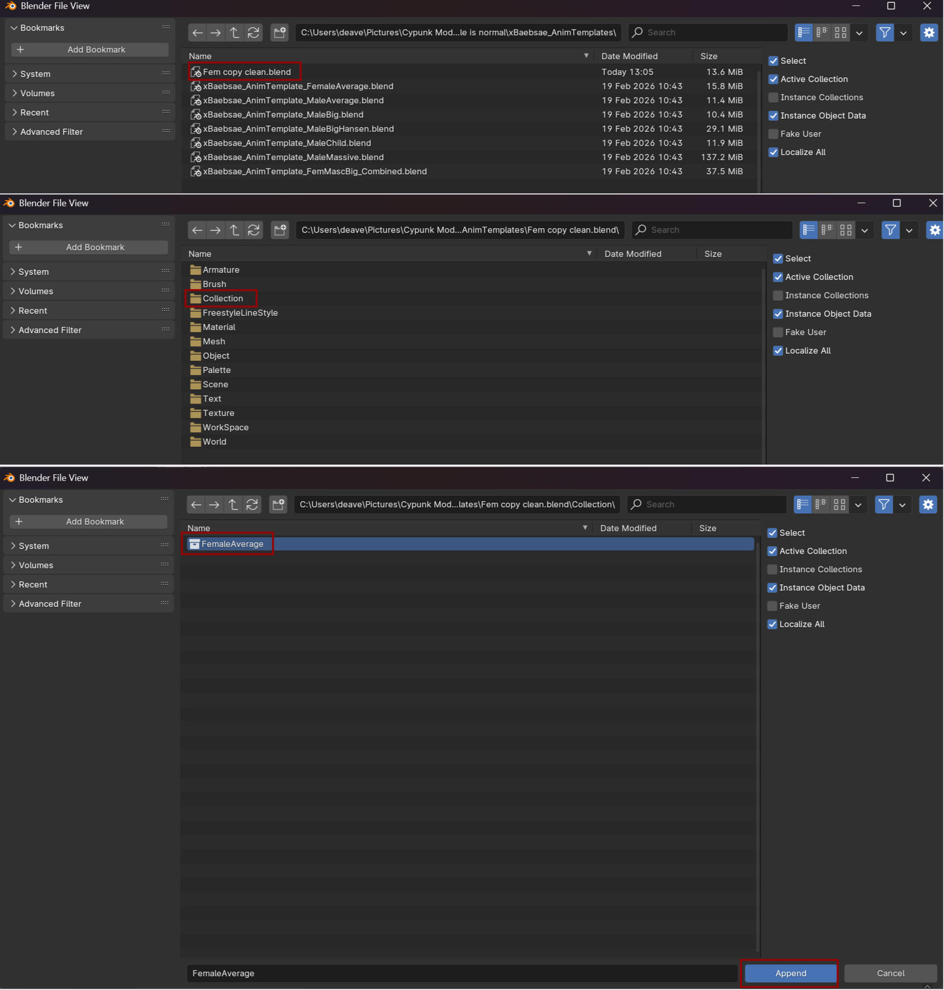 A new window will open. Find the file you just copy saved, in my case I named it Fem Copy Clean. Double click and it will take you to a bunch of folders, we want the Collection folder in this case. In there will be the collection you saved, FemaleAverage for me. Select it and press Append in the bottom.